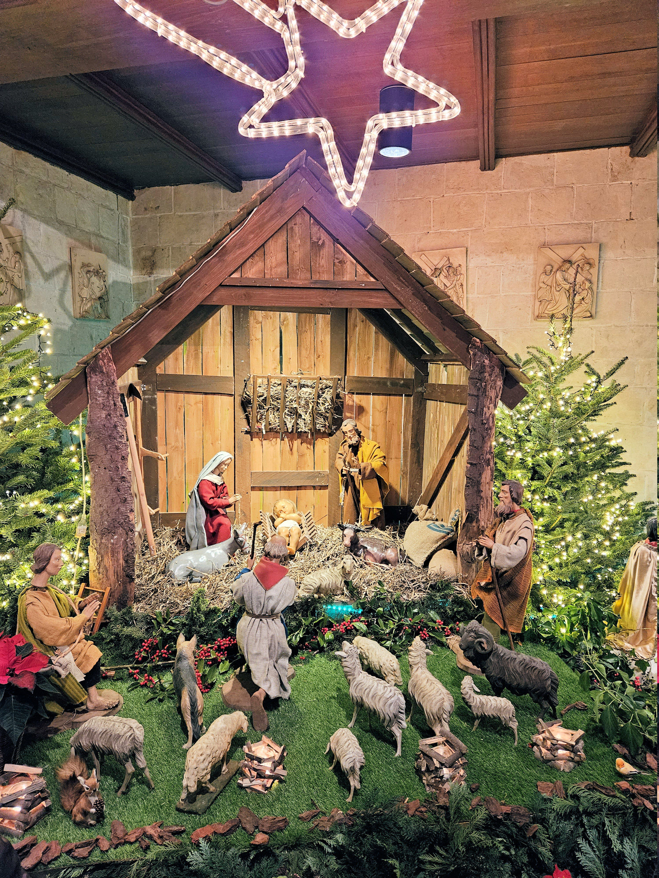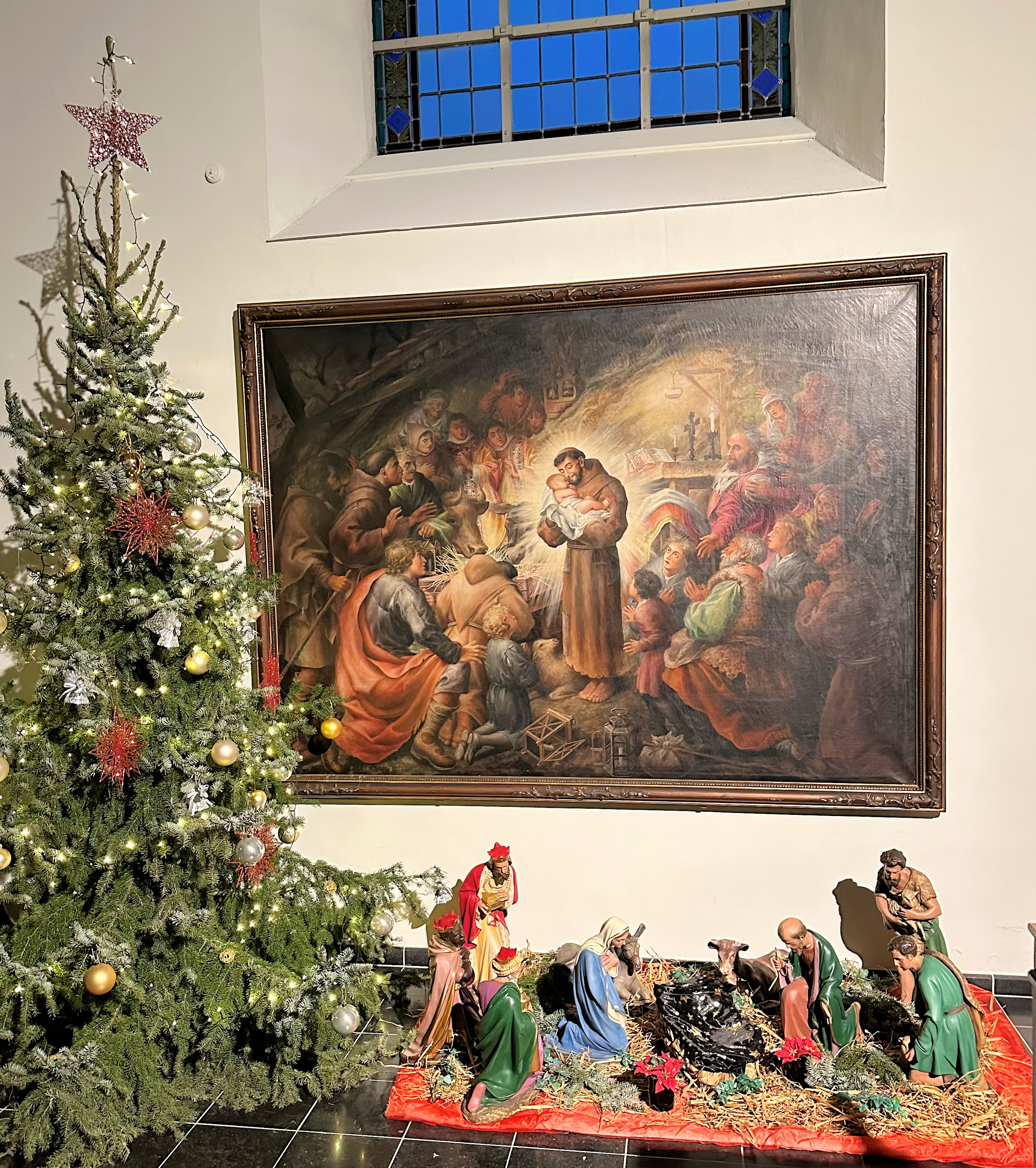 In de Sint-Maartenskerk in de Metselstraat te Vissenaken kan je in deze tijd van het jaar alle dagen tussen 9 en 18 uur de kerststal bezoeken. Het kersttafereel is opgebouwd vlak voor een heel bijzonder schilderij. Het grote schilderij op doek (189 x 251 cm) hangt aan de zuidmuur van het koor en stelt Sint-Franciscus bij de boreling Jezus voor, geschilderd door Pater Andreas Bosteels (Léon Bosteels). Signatuur van deze laatste bevindt zich, samen met de datum, in de linkeronderhoek van het schilderij: ‘Pater Andreas Bosteels. O.F.M. 1938’. O.F.M. staat voor ‘Ordo Fratrum Minorum’.