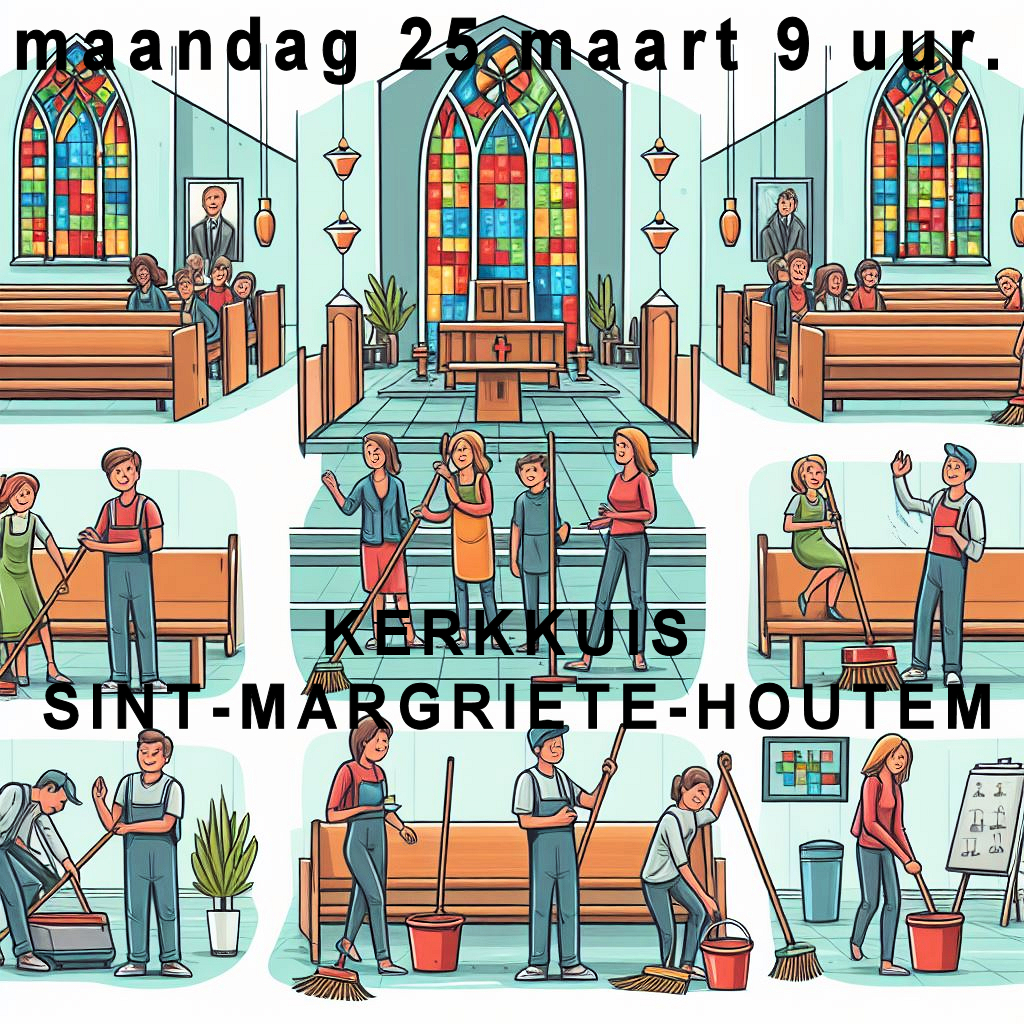 Wij willen de mensen die de verrijzenis van Christus komen vieren, in een aangename en verzorgde omgeving ontvangen. Daarom kuisen wij de kerk voor Pasen. Deze kuis gaat door op maandag 25 maart 2024 vanaf 9 uur. Vele handen maken het werk licht. Kunnen wij ook op jouw helpende handen rekenen?